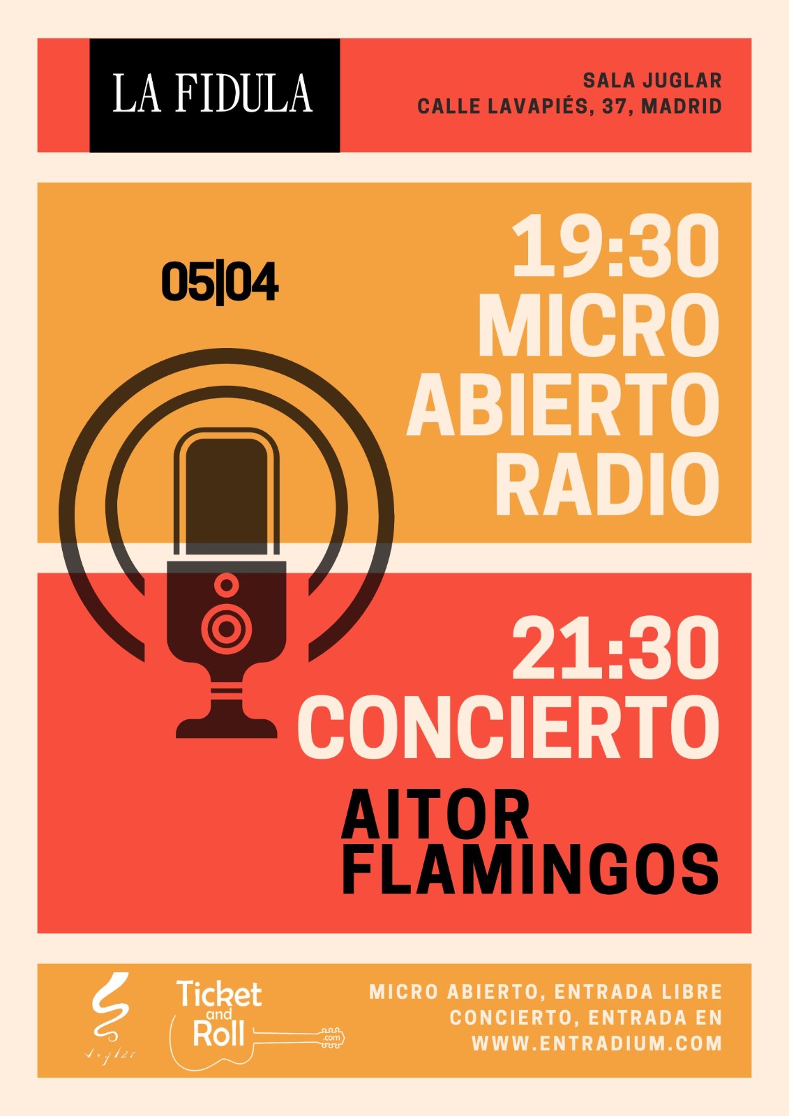 Tras el Micro Abierto Radio tendrá lugar, en la misma Sala Juglar, el concierto de Aitor Flamingos, quien estará acompañado del magnífico violinista Manu Clavijo. Las entradas para el concierto de Aitor Flamingos se pueden adquirir en Ticket and roll: https://ticketandroll.com/evento/aitor-flamingos-y-manu-clavijo-en-concierto/